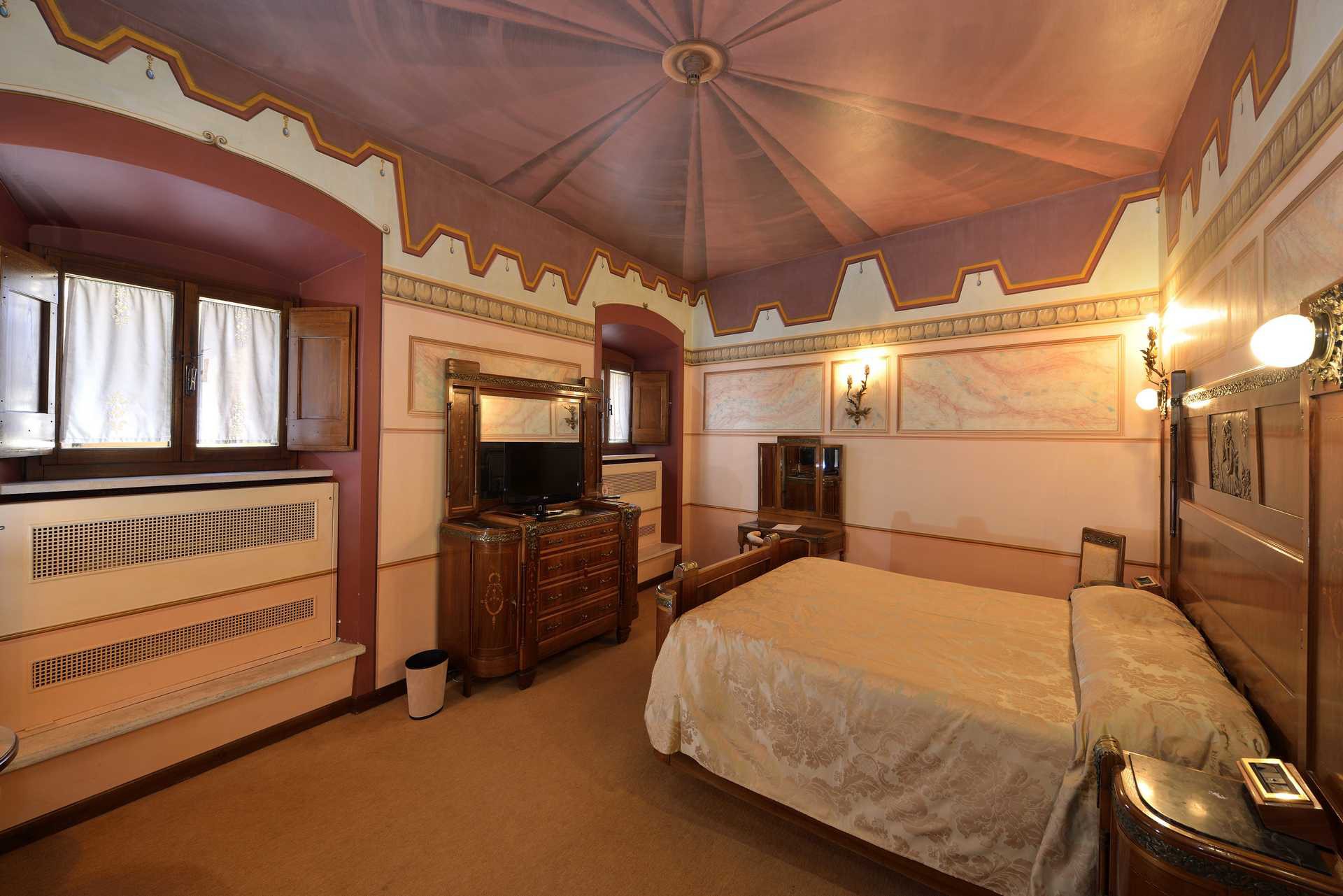 La Junior Suite Novecento, in stile primi del ‘900, come sottolinea il nome, è arredata con mobili originali degli anni Venti e caratterizzata da bassorilievi in bronzo di particolare pregio. Un fantastico trompe-d’œil a tendaggio d’epoca corona la Suite. Anche in questo caso il bagno è particolare perché sfoggia pregiati marmi verdi e una vasca idromassaggio.