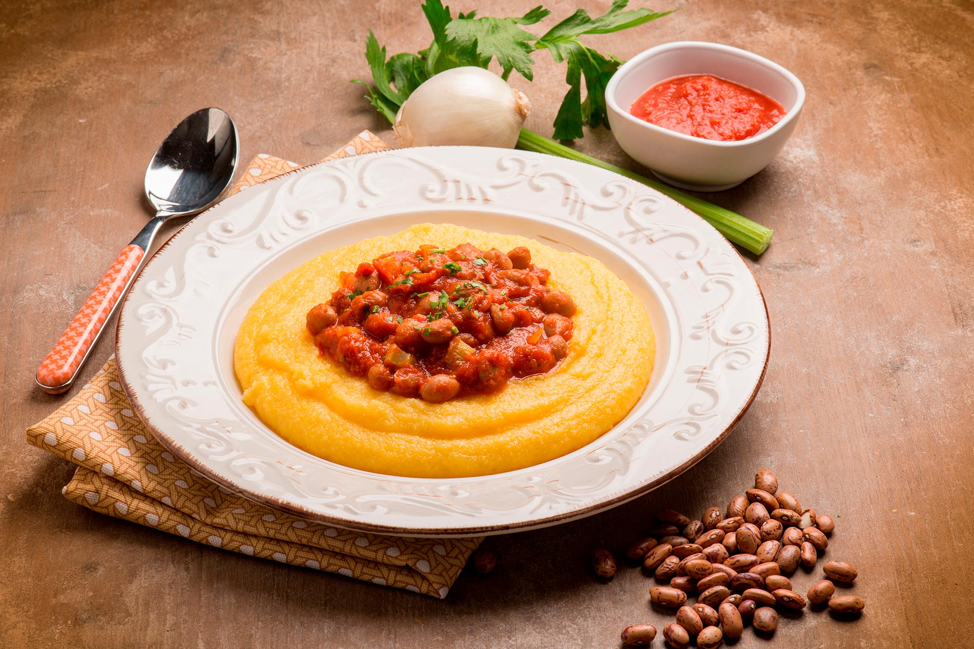 I fagioli vanno messi a bagno la sera prima e lasciati per tutta la notte in abbondante acqua fredda. Trascorsa la notte potete iniziare con la preparazione procedendo a lessare i fagioli utilizzando acqua diversa da quella usata per l’ammollo. La cottura va effettuata per circa un’ora e comunque fin quando i fagioli non sono ben cotti e teneri dopodiché è possibile scolarli e tenerli da parte. Iniziate quindi a cuocere la polenta: mettete a bollire l’acqua in una pentola grande e una volta che è arrivata a bollore versate la farina lentamente, mescolando contemporaneamente con una frusta per evitare la formazione di grumi. Chiudete con il coperchio e, a fuoco basso, lasciate cuocere per circa 40 minuti continuando a mescolare frequentemente. Mentre la polenta cuoce fate un battuto con il lardo e la cipolla, mettetelo quindi in un tegame con olio, carota e sedano e fate scaldare. Quando inizia a soffriggere aggiungete la salsa di pomodoro o, meglio ancora, i pomodori tagliati a piccoli pezzi e, subito dopo, mettete in pentola anche i fagioli che avete lessato, salate e fate cuocere ancora per 10/15 minuti, aggiungendo anche del pepe se volete dare al vostro piatto un sapore più deciso. Una volta che sia i fagioli che la polenta sono pronti uniteli: per presentare il piatto al meglio potete realizzare una base di polenta con sopra uno strato omogeneo di fagioli accompagnati dal sugo di cottura. Se volete, spolverate il tutto con del pecorino e servite ben caldo: ogni commensale potrà mischiare direttamente nel proprio piatto una volta che avrete diviso in porzioni.